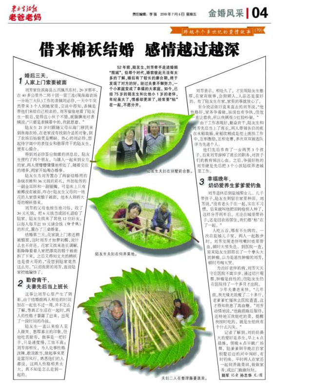 在今天出版的東方生活報四版《金婚風采》欄目上,全版刊登了淮海農場退休老人陸友生和劉芳結婚52年來的愛情故事,這也是該欄目今年以來,第7次以整版的文字和圖片形式,刊載淮海老人的愛情故事?,F(xiàn)轉摘東方生活報上這篇金婚故事,讓大家一睹為快。