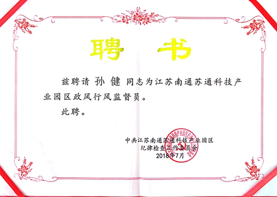 蘇通科技產(chǎn)業(yè)園區(qū)黨工委副書(shū)記金志偉充分肯定了南通公司紀(jì)委工作,對(duì)墾地廉潔共建和南通公司紀(jì)委工作提出了具體要求。座談會(huì)上,園區(qū)紀(jì)工委向南通公司紀(jì)委書(shū)記孫健頒發(fā)了蘇通科技產(chǎn)業(yè)園區(qū)行風(fēng)監(jiān)督員的聘書(shū)。