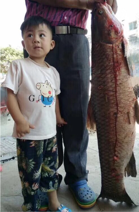 圍觀的人請袁幕輝將魚拎起來,看看有多長?袁幕輝將魚拎起來,魚頭超過了他的腰眼;袁幕輝的孫子金小貝看到爺爺釣到一條大魚,高興地圍著爺爺轉(zhuǎn)來轉(zhuǎn)去:“喲,這么大的魚!比我還高喱。”。幫助袁幕輝將魚從水里弄上來的辛師傅,拎著大青魚到附近菜市場的磅秤上稱一下,即使大青魚半截尾巴拖在地上,魚頭還超過了他的腰眼。他稱了一下,這條大青魚正好35斤。