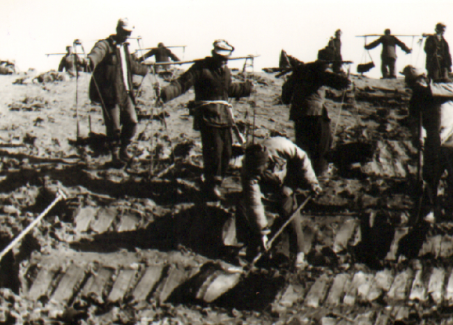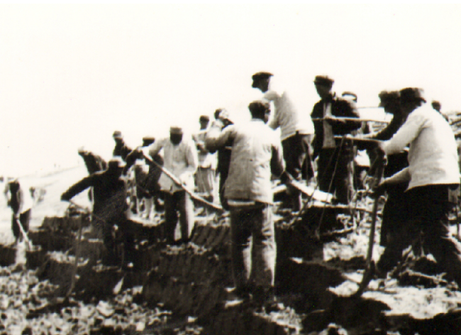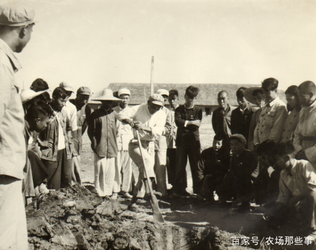 正因?yàn)榻S寻l(fā)明的“‘江大鍬’挖土法”在全農(nóng)建四師的成功推廣和在水利戰(zhàn)役中的優(yōu)良表現(xiàn),1953317日,他被農(nóng)建四師表彰為"特等功臣"。并成為淮海農(nóng)場(chǎng)建場(chǎng)60周年的10大知名人物。圖一是江希友在水利工地作挖溝示范。
