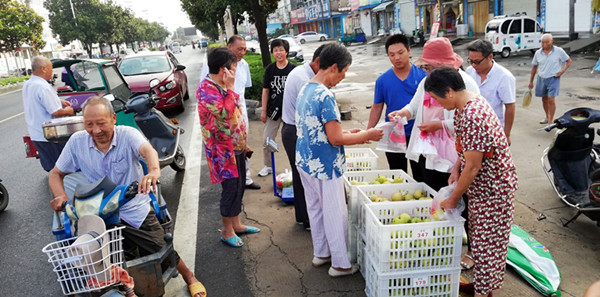 自7月15日三河梨園采摘季開始以來,三河社區(qū)的6名工作人員便從管理人員的角色轉(zhuǎn)變?yōu)?ldquo;賣貨郎”,每天清晨天不亮,修士超、張偉等6名年輕的管理人員便每天堅持將精品包裝撿挑余下的四級梨分散到農(nóng)場農(nóng)貿(mào)市場和周邊鄉(xiāng)鎮(zhèn)的集市去賣,他們街邊擺攤設(shè)點叫賣的吆喝聲吸引得不少大爺大媽的圍觀并爭相購買三河梨,大家一邊買梨一邊樂呵呵的說,現(xiàn)在的干部可真行,賣起來梨來也是有模有樣的。