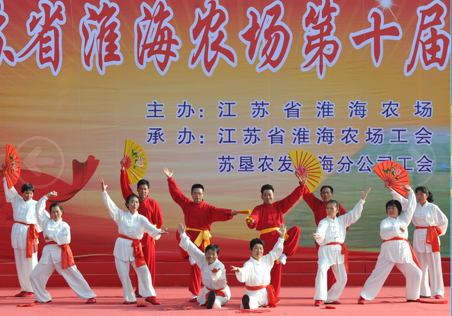 在江蘇農(nóng)墾淮海農(nóng)場(chǎng)文化廣場(chǎng)上,每天清晨總是有退休老人組成的太極拳晨練隊(duì)伍,他們總是身著純白或鮮艷色彩的太極練功服,在規(guī)定的時(shí)間內(nèi)相聚在一起,并在音樂(lè)的旋律中,時(shí)而由內(nèi)而外舒緩出自然的動(dòng)作,靜心用意,呼吸自然;時(shí)而連貫協(xié)調(diào),虛實(shí)分明的姿勢(shì),保持了身段的柔和穩(wěn)定;時(shí)而輕靈沉著,剛?cè)嵯酀?jì)的姿態(tài),無(wú)不是經(jīng)過(guò)淮海路的職工居民展示著莫大的太極功底。這支由農(nóng)場(chǎng)退休職工胡建軍為太極隊(duì)隊(duì)長(zhǎng),趙梅生為教練的太極隊(duì)伍,每天在人們的注視目光中隨著朝陽(yáng)而舞,使每一個(gè)參練隊(duì)員做到了心無(wú)旁騖,其專注的眼神、流利的動(dòng)作、恰到好處的姿勢(shì),成為朝陽(yáng)下淮海農(nóng)場(chǎng)小城鎮(zhèn)建設(shè)健身體育中最美的風(fēng)景。