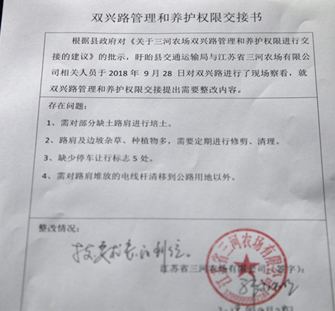 9月28日下午盱眙縣交通局相關(guān)負責人來到三河農(nóng)場有限公司簽訂《雙興路管理和養(yǎng)護權(quán)限交接書》,正式接管三河農(nóng)場雙興路。