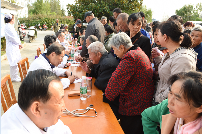 下午2點(diǎn)鐘開始,在淮海農(nóng)場門診大樓門前,來自揚(yáng)州大學(xué)普外科常見病、多發(fā)病和疑難危重疾病的診治專家,醫(yī)學(xué)博士,外科學(xué)教授、主治醫(yī)師張培健;內(nèi)分泌科專家教授、主任醫(yī)師丁立;呼吸內(nèi)科主任醫(yī)師蔣有娟;心血管內(nèi)科副主任醫(yī)師嚴(yán)俊峰;揚(yáng)州大學(xué)副教授,蘇北人民醫(yī)院中醫(yī)科主任醫(yī)師,中醫(yī)內(nèi)、兒科專家孫保生;中醫(yī)科主任醫(yī)師,骨科專家李寧;心理學(xué)副教授王慧和副教授、附屬醫(yī)院神經(jīng)外科主任醫(yī)師武永康等8名離退休專家一字排開,端坐在條桌前,拉開了為淮海農(nóng)場社區(qū)的廣大職工居民開展義診活動(dòng)的帷幕。