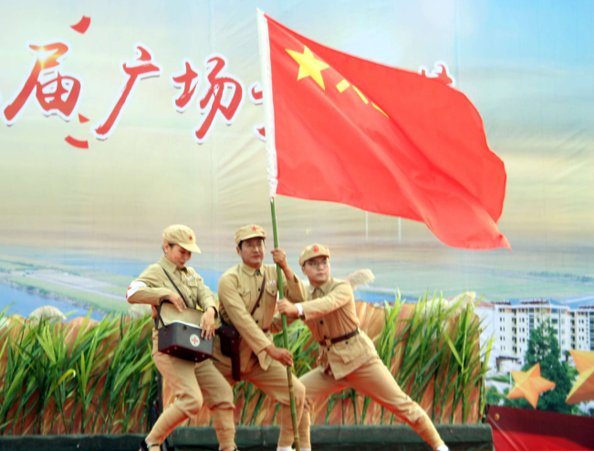 在眾多的節(jié)目中,當天曾獲得“江蘇農(nóng)墾第二屆文藝匯演大賽” 原創(chuàng)作品一等獎的的《奮斗的音符》最引人注目,因淮海農(nóng)場有限公司的前身部隊——中國人民解放軍步兵第102師曾經(jīng)參加過著名的淮海戰(zhàn)役?!秺^斗的音符》中有一段司號員吹響向敵人發(fā)起沖鋒的沖鋒號。在沖鋒號的指引下,102師指戰(zhàn)員以排山倒海之勢,向敵人陣地發(fā)起了沖鋒,再現(xiàn)淮海前身部隊102師將士在淮海戰(zhàn)役戰(zhàn)場上沖鋒陷陣、英雄殺敵的場景。