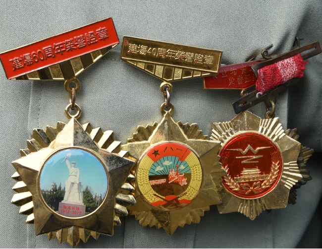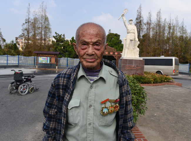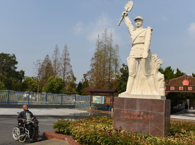 在淮海農(nóng)場(chǎng)農(nóng)建四師戰(zhàn)士紀(jì)念碑下,每天我們都可見到一位老人坐在輪椅上,瞻仰著農(nóng)建四師戰(zhàn)士雕像,因老人胸口常年佩帶像章的緣故,這3枚金質(zhì)像章已經(jīng)略顯褪色,但從老人堅(jiān)毅的目光中,仿佛在心中期盼著什么。這個(gè)人就是城西居委會(huì)振興小區(qū)92歲高齡的退休老干部胡鐵成。