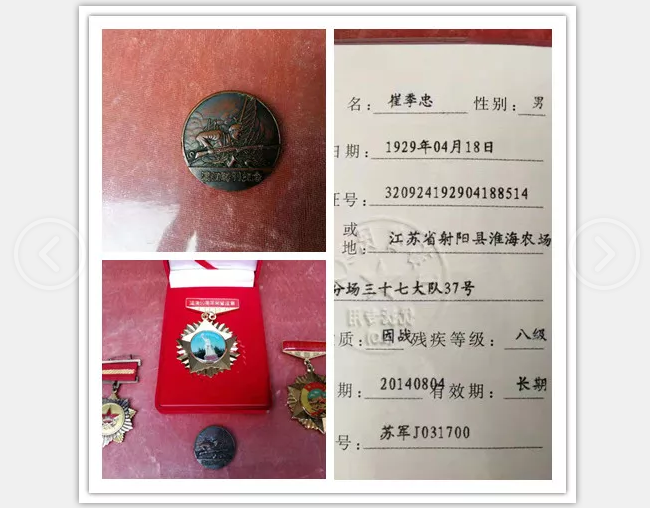 1929年出生的崔季忠今年已經(jīng)90歲,崔季忠老人最先在許世友將軍轄區(qū)的12縱隊,老人跟了許世友將軍3年,在鹽城劉莊戰(zhàn)役三進三出中就有崔季忠的身影,戰(zhàn)役最終只有老人和其他兩位戰(zhàn)友幸存下來,但他們整個部隊在只剩3個人的情況下,仍然抓獲了40多名俘虜。崔季忠的嘴是在淮海戰(zhàn)役中攻打濟南時受的傷,并被炮彈打掉了3顆牙齒,負傷后轉(zhuǎn)到六分區(qū)訓練新兵,后又轉(zhuǎn)到102師參加渡江戰(zhàn)役,直接打到上海。之后他又修整了3個月,最后參與了解放崇明戰(zhàn)爭,并在1952年到淮海農(nóng)場參與建設。