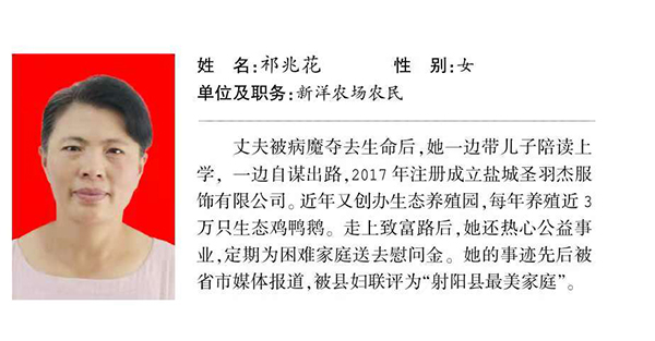 近日,傳來喜訊,祁兆花被評為第五屆“最美射陽人”。丈夫被病魔奪去生命后,祁兆花一邊帶兒子陪讀上學,一邊自謀出路,2017年注冊成立鹽城圣羽杰服飾有限公司。近年又創(chuàng)辦生態(tài)養(yǎng)殖園,每年養(yǎng)殖近3萬只生態(tài)雞鴨鵝。走上致富路后,她還熱心公益事業(yè),定期為困難家庭送去慰問金。她的事跡被省市媒體報道,先后被評為鹽城市第二季“最美巾幗”、射陽縣“最美家庭”等。
