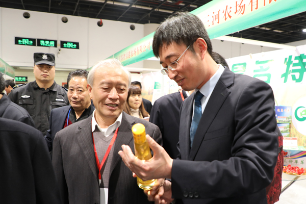 交易會開幕當(dāng)日,江蘇省農(nóng)業(yè)農(nóng)村工作領(lǐng)導(dǎo)小組副組長胥愛貴等領(lǐng)導(dǎo)巡館來到江蘇農(nóng)墾展館,在集團(tuán)公司企劃部負(fù)責(zé)人和朱明亮的陪同下,專程到臨海農(nóng)場公司展位調(diào)研指導(dǎo)。朱明亮向領(lǐng)導(dǎo)介紹,近年來農(nóng)場公司按照省委和集團(tuán)公司黨委的統(tǒng)一部署,利用資源和組織化優(yōu)勢,推進(jìn)企業(yè)高質(zhì)量發(fā)展,推動產(chǎn)業(yè)提檔升級,塑造生態(tài)健康農(nóng)副產(chǎn)品??梢陨缘慕】涤?ldquo;綠農(nóng)園”牌牡丹籽油就是公司推出的優(yōu)質(zhì)精品之一。胥愛貴說,知道臨海農(nóng)場在射陽縣境內(nèi),對臨海農(nóng)場公司種植油用牡丹、發(fā)展牡丹籽油產(chǎn)業(yè)的情況有所了解。他指出,江蘇農(nóng)墾及臨海農(nóng)場公司要在推進(jìn)現(xiàn)代農(nóng)業(yè)建設(shè)和推進(jìn)質(zhì)量可追溯的健康農(nóng)副產(chǎn)品方面發(fā)揮示范引領(lǐng)作用;要通過交易會這個平臺,推出更多、更好的優(yōu)質(zhì)農(nóng)副產(chǎn)品給上海大眾,展示江蘇現(xiàn)代農(nóng)業(yè)發(fā)展的成就,讓上海各界人士更好地了解江蘇及品味江蘇優(yōu)質(zhì)農(nóng)產(chǎn)品。一同參加巡館的江蘇省糧食局夏春勝局長詳細(xì)詢問了“綠農(nóng)園”牌牡丹籽油的種植、生產(chǎn)、品牌開發(fā)及經(jīng)營銷售等情況。