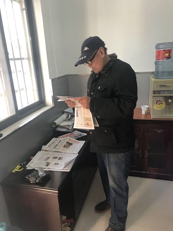 城東居委會主任邱金龍告訴筆者,起初是他偶爾將報紙上看到的社會新聞及農(nóng)場趣事分享給老人們,發(fā)現(xiàn)他們都饒有興致,于是就將報紙都整理出來放在矮柜上讓老人們自己翻閱,久而久之,就形成了這個“報紙角”。邱主任說,這些報紙放著也是放著,與其堆在角落里落灰,不如拿來給老人們讀一讀,鍛煉他們的理性思維能力,豐富他們的科學(xué)文化知識,充實他們的精神文化生活,他們看的開心,我們也覺得很有意義。老人們也不挑剔,默不作聲,有什么就看什么,漸漸地,大家都不約而同,隔段時間就來看看有沒有新報紙。