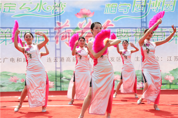 荷之形,亭亭玉立、搖曳多姿,代表著生態(tài)自然、秀外慧中的云臺形象。緊接著荷文化文藝匯演在精彩的開場鼓《盛世鼓舞》節(jié)目后正式拉開帷幕。本次荷花節(jié)的宣傳亮點是開通了連云港手機臺全程直播,吸引了3萬多名游客在網(wǎng)上收看荷花節(jié)直播盛況。開幕式還特別邀請了連云港市廣播電視臺著名主持人李華參與主持,音樂人王從鍵和交通廣播主持人小海分別送上了動聽的歌曲。接下來,大家一起欣賞了淮海戲折子戲《回娘家》、非遺項目海州五大宮調《一輪明月》、武術表演《臥虎藏龍》、農(nóng)場公司舞蹈《花樣年華》等節(jié)目,贏得了現(xiàn)場嘉賓及游客的陣陣掌聲。演出現(xiàn)場還穿插了紅包雨、幸運游客抽獎等互動環(huán)節(jié),吸引了眾多游客熱情參與,現(xiàn)場氛圍十分活躍。