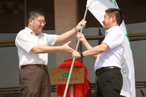 在揭牌授旗儀式上,姚準(zhǔn)明和董光威為新洋農(nóng)場新時代文明實踐中心揭牌。楊義林向新洋農(nóng)場有限公司黨委副書記、董事長、總經(jīng)理潘元海授新洋農(nóng)場志愿者服務(wù)總隊隊旗。新洋農(nóng)場有限公司黨委書記陳守軍致辭。