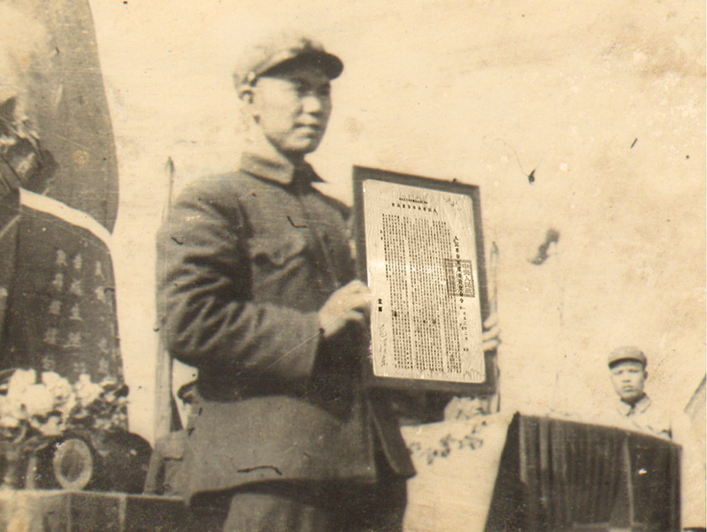 圖為中國人民解放軍步兵第102師副師長李桂蓮在海門縣三廠鎮(zhèn)接受命令時(shí)的鏡頭。