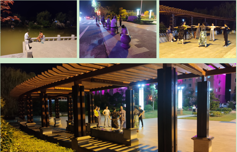 在淮海農(nóng)場,當(dāng)夜晚來臨的時候,許多人都喜歡到淮海公園中去走一走,看一看,或坐一坐,跳一跳,因為在公園那兒,既可以與居民們相約聊天,相互散步,也可以坐在燈光下,欣賞著河岸的風(fēng)光,享受下濃墨重彩的韻味。當(dāng)然,也可以在怡然自得中,聽一聽那些舞蹈人播放的音樂,目睹下他們翩翩起舞的姿態(tài),而對忙碌一天的居民來說,在這里可以找到最原始的放松形式,讓身心的疲憊在公園中得到充分地釋放。