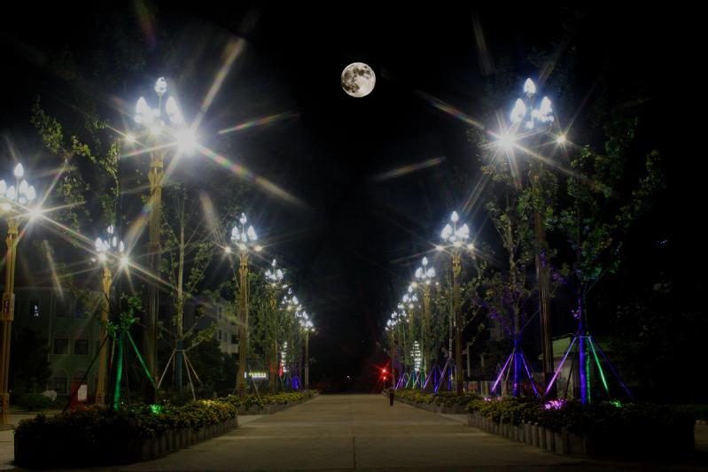 中秋之夜,新洋城鎮(zhèn)華燈齊放,尤其是中心花園、黨建廣場(chǎng)和徑九路上新安裝的18盞新穎靚麗的高桿路燈格外明亮,與十五的圓月交相輝映,新洋的夜晚更亮麗。
