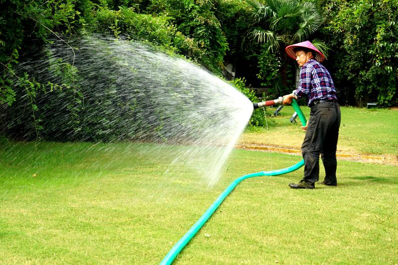 圖為管護工為草地澆水