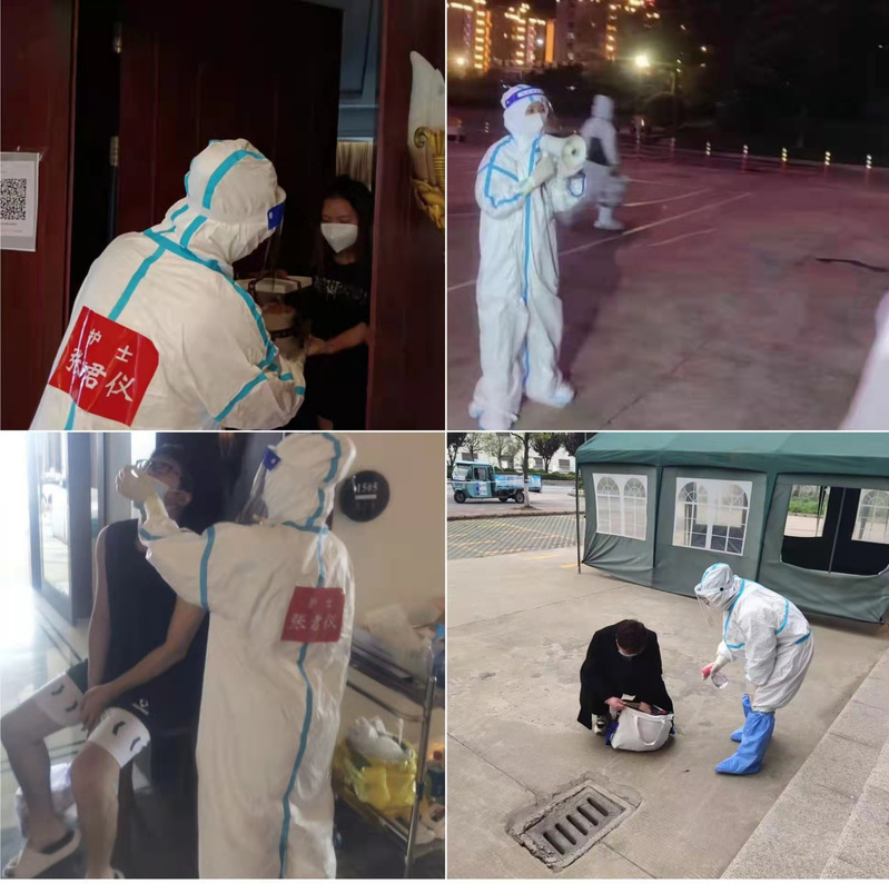 隔離點的工作繁瑣、繁雜,防護措施嚴(yán)格,每次進入隔離區(qū)前要在準(zhǔn)備間戴帽子和N95口罩、穿防護服、戴護目鏡、穿靴套等保護設(shè)施,穿戴好防護用品后,她給隔離人員分發(fā)三餐,配備1:1000的消毒液進行隔離房間的環(huán)境消殺,并將所有隔離人員的物資、生活用品、所產(chǎn)生的醫(yī)療及生活垃圾都要一層一層爬樓梯搬運,由于射陽西區(qū)人才公寓隔離點沒有電梯,再加上嚴(yán)實密不透風(fēng)的防護服,就是一動不動,也會大汗淋漓,每次都是內(nèi)層衣濕透,汗流浹背,工作完成一半就已經(jīng)精疲力盡,只能原地休息幾分鐘再繼續(xù)上下樓梯完成工作,一套流程做下來都要近五個小時。有時面對不理解、有抵觸情緒的人員,她會以盡心盡力的服務(wù)給他們以溫暖、依靠、希望及強有力的支撐,她說:隔離是對自己負(fù)責(zé)、對大家負(fù)責(zé)、更是對我們國家負(fù)責(zé),你們是為國家早日戰(zhàn)勝疫情作貢獻,鼓勵他們積極配合隔離點做好隔離工作。