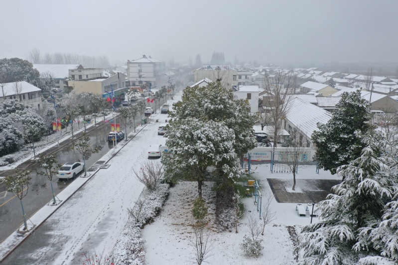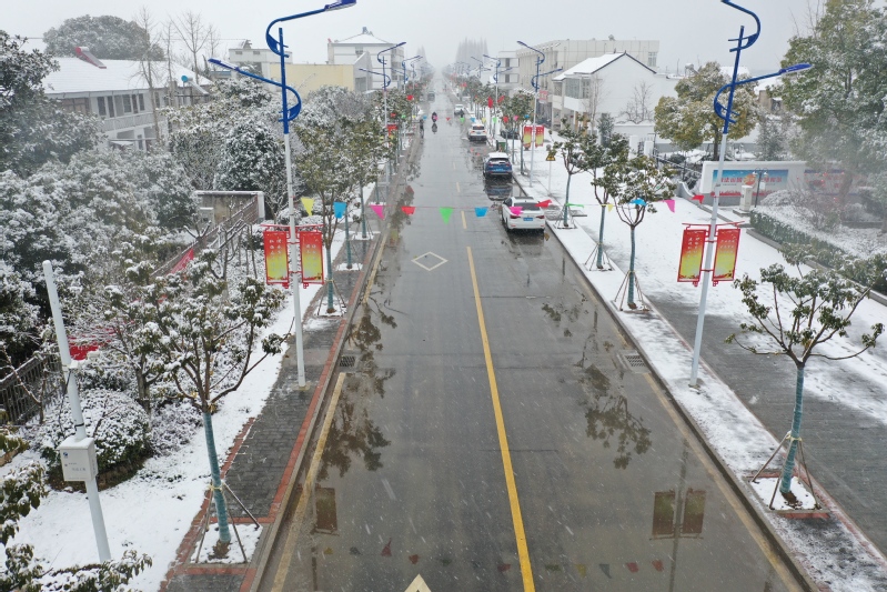 高大的銀杏樹、柿子,落光了葉子的枝杈上,一條條毛茸茸、亮晶晶的銀條兒好像蟄伏著的蠶蟲;修長(zhǎng)的香樟、低矮的柏樹,四季常青枝葉上一朵朵蓬松松、沉甸甸的雪球,仿佛舉起的棉花糖。“呼……”一輛晨起的公交車閃著光駛過(guò),一面面紅旗也迎風(fēng)雀躍起來(lái),似乎在說(shuō)“又是一個(gè)豐收年”。