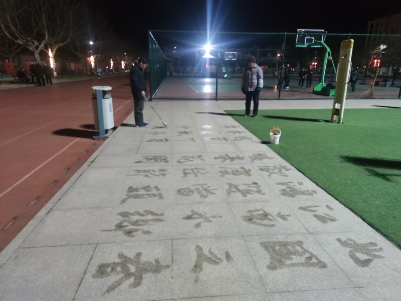在淮海職工休閑體育運動廣場上,我們在夜晚燈光下在廣場散步時,經(jīng)??梢钥吹揭粋€中年人正在專心致志地在廣場大理石的地面上寫地書。只見他用一種如椽大筆在大理石上書寫著,這種地書筆有長長的桿子,用海綿做成的特殊筆頭,既能方便環(huán)保,又不用紙墨,只是用一個小桶拎著水,就可以蘸水在地上寫字。