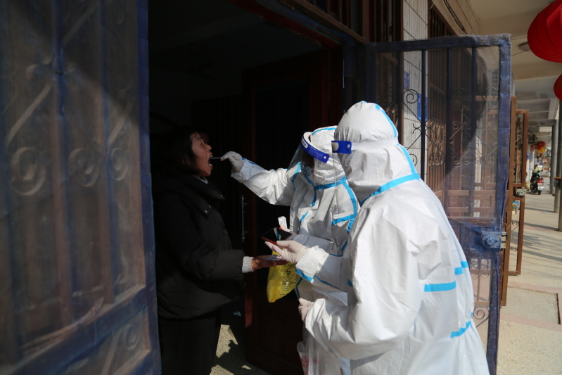3月5日,連云港市海州區(qū)通報發(fā)生新冠肺炎疫情,形勢十分嚴峻。崗埠上下迅速行動起來,按照要求組織開展全員核酸檢測。全員核酸檢測要求一天內(nèi)對崗埠所有在家人員進行檢測,農(nóng)場四個點位同時開始,負責檢測的人員特別緊張。馬素蓮得知這一情況,主動和相關(guān)人員溝通,暫停了自家門診,帶領(lǐng)醫(yī)生錢冬梅、護士錢明霞加入了振興廣場籃球場監(jiān)測點的核酸檢測人員隊伍。從3月5日到11日,她們?nèi)艘恢眻允卦诤怂釞z測一線,每天檢測人員合計達到兩三千人。有時候,她們需要配合網(wǎng)格員深入鎮(zhèn)區(qū)、生產(chǎn)區(qū)各居委會上門為行動不便的人員進行采樣,足跡遍布大街小巷,密不透風的防護服常常讓她們滿臉通紅透不過氣來。護士錢明霞告訴筆者,3月11日當天,她負責部分小區(qū)的核酸采樣工作,光是6樓就爬了6次,腿最后跟灌了鉛一樣,挪不動?!坝袝r候晚上嘴里吃著東西就睡著了。”