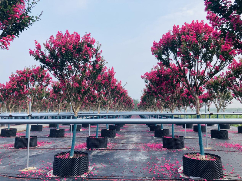 新洋林業(yè)公司容器苗三期當(dāng)下正是一幅花開似霞的盛景,紫薇花團(tuán)團(tuán)簇簇掛滿枝頭,相當(dāng)奪目。拳頭產(chǎn)品“四川紅”紫薇是農(nóng)場公司黨委和林業(yè)公司4月份頂著疫情的壓力,積極爭取引進(jìn)的產(chǎn)品,到了7月份便成為了附近居民的網(wǎng)紅打卡產(chǎn)品,獲得了居民們的一致好評和稱贊。其花期極長,從6月一直持續(xù)到10月,宋代楊萬里贊曰:“誰道花無紅百日,紫薇常放半年花?!泵鞔ピ娫疲骸白限遍_最久,爛漫十旬期?!币虼?,紫薇也有“百日紅”之稱。
