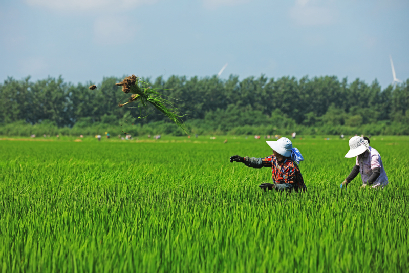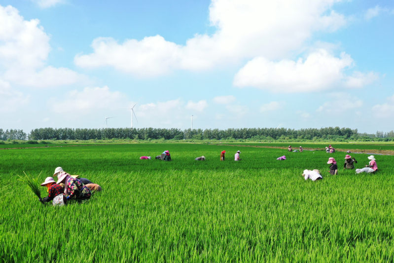 蘇墾農(nóng)發(fā)寶應(yīng)湖分公司擁有3500畝有機(jī)稻生產(chǎn)基地,該基地于2021年取得歐盟、國環(huán)雙認(rèn)證。為保障有機(jī)稻質(zhì)量,每到夏季,公司都會組織進(jìn)行人工拔“雜草稻”。高溫炙烤下,200多名勞動者揮汗如雨,為生產(chǎn)出“魚米之鄉(xiāng)”高質(zhì)量有機(jī)米貢獻(xiàn)力量。