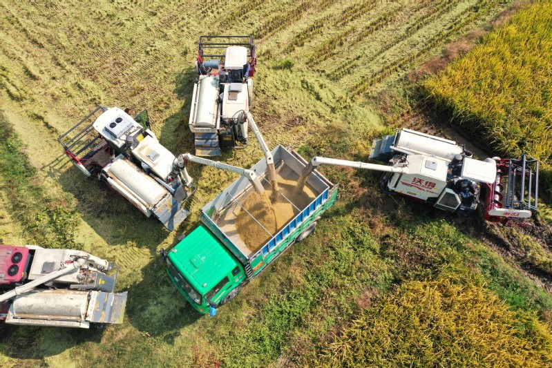 1017日,寶應(yīng)湖農(nóng)場(chǎng)5萬(wàn)畝稻田開(kāi)鐮試割。三四臺(tái)收割機(jī)來(lái)回穿梭、相互協(xié)作,粒粒飽滿的水稻收割脫粒,很快就被裝進(jìn)運(yùn)輸車?yán)?,隨后運(yùn)送至場(chǎng)頭過(guò)磅晾曬。農(nóng)技人員穿梭在剛收割完畢的田塊里,根據(jù)收割機(jī)的實(shí)際收割質(zhì)量,進(jìn)行指揮調(diào)整,把“豐收在望”變成“豐收在手”。