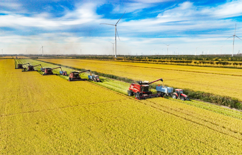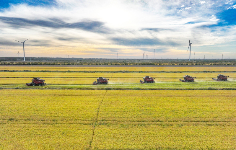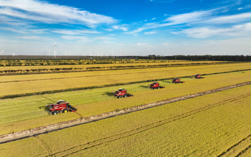 2023年10月28日,在蘇墾農(nóng)發(fā)新洋分公司新南生產(chǎn)區(qū)19大隊的高標(biāo)準(zhǔn)農(nóng)田上,五臺凱斯7088大型聯(lián)合收割機穿梭在稻田中搶收水稻。蘇墾農(nóng)發(fā)新洋分公司搶抓晴好天氣,發(fā)揮農(nóng)墾企業(yè)機械化優(yōu)勢,確保秋糧顆粒歸倉。