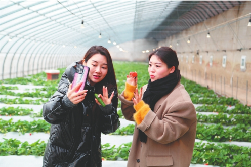 1月16日,江蘇省崗埠農(nóng)場(chǎng)富民農(nóng)業(yè)科技園溫室大棚內(nèi),工作人員正在抖音直播平臺(tái)向消費(fèi)者推介園區(qū)的果蔬、花卉產(chǎn)品。通過(guò)開(kāi)辟線上銷(xiāo)售“新賽道”,讓手機(jī)成為新“農(nóng)具”,讓直播間成為新“柜臺(tái)”,拓寬農(nóng)產(chǎn)品銷(xiāo)售渠道,帶動(dòng)全場(chǎng)溫室大棚種植戶增收。