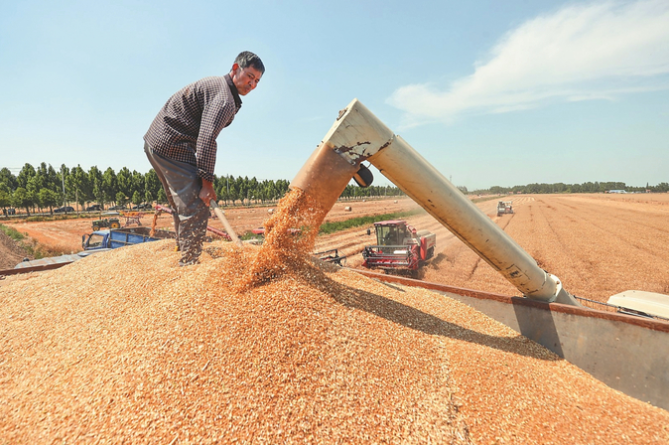 昨日,位于淮安盱眙洪澤湖畔的江蘇農(nóng)墾三河農(nóng)場的3.82萬畝小麥開鐮收割。據(jù)測產(chǎn),三河農(nóng)場今年小麥總產(chǎn)量可達(dá)4400萬斤,90%以上將作為優(yōu)質(zhì)種子,供應(yīng)長三角地區(qū)及河南等地。通訊員 許昌銀 本報記者 余萍 攝