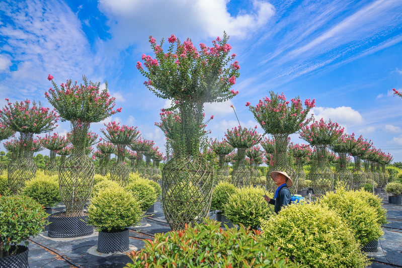 8月14日,在江蘇省鹽城市射陽縣,江蘇農(nóng)墾新洋農(nóng)場容器苗項目基地,管理人員正在養(yǎng)護紫薇花瓶。近年來,新洋農(nóng)場利用容器苗基地優(yōu)勢,在栽培方式上大膽嘗試,通過扦插培育,實現(xiàn)了自繁自育栽培技術(shù)的新突破,容器栽培的模式使苗圃成活率更高、綠化效果更好,優(yōu)良的品質(zhì)廣受全國各地綠化項目方的青睞。