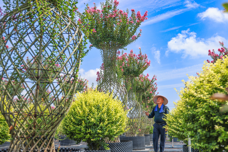 8月14日,在江蘇省鹽城市射陽縣,江蘇農墾新洋農場容器苗項目基地,管理人員正在養(yǎng)護紫薇花瓶。近年來,新洋農場利用容器苗基地優(yōu)勢,在栽培方式上大膽嘗試,通過扦插培育,實現(xiàn)了自繁自育栽培技術的新突破,容器栽培的模式使苗圃成活率更高、綠化效果更好,優(yōu)良的品質廣受全國各地綠化項目方的青睞。