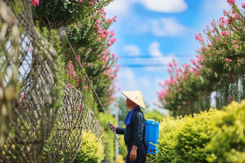 8月14日,江蘇省鹽城市射陽縣,在江蘇農(nóng)墾新洋農(nóng)場容器苗項(xiàng)目基地,管理人員正在為紫薇花瓶噴施藥物防病治蟲。據(jù)悉,新洋農(nóng)場建成配有水肥一體、智能控制等設(shè)備的容器苗圃200畝。張偉生攝(中經(jīng)視覺)