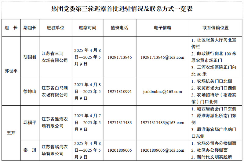 集團(tuán)黨委巡察組將在被巡察農(nóng)場現(xiàn)場巡察1個月左右,期間設(shè)立專門值班電話、電子信箱、聯(lián)系信箱等,主要受理反映被巡察農(nóng)場黨委領(lǐng)導(dǎo)班子及其成員、相關(guān)重點(diǎn)崗位干部(含已離退休、已調(diào)離)問題的來信來電來訪,重點(diǎn)是關(guān)于違反政治紀(jì)律、組織紀(jì)律、廉潔紀(jì)律、群眾紀(jì)律、工作紀(jì)律和生活紀(jì)律等方面的舉報和反映。其他不屬于巡察受理范圍的信訪問題,將按規(guī)定由有關(guān)部門認(rèn)真處理。信訪受理時間截止到2025年5月7日。