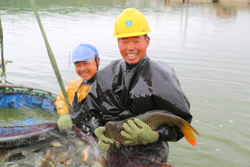 正值淡水魚出塘上市季節(jié),江蘇省連云港市海州區(qū)江蘇農(nóng)墾崗埠農(nóng)場南漁場,大型吊車正在起網(wǎng)捕撈鯉魚,一幅人歡魚躍的水上夏收景象。圖為漁民在展示捕撈的大鯉魚?! ⌒煨l(wèi) 攝(來源:大國三農(nóng))