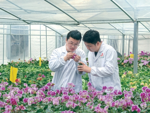 圖為農(nóng)場(chǎng)技術(shù)人員正在查看蝴蝶蘭種苗?!∈茉L者供圖