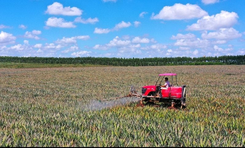 友好農(nóng)場(chǎng)的萬畝菠蘿田處于菠蘿生長(zhǎng)黃金地帶,早期主要種植巴厘品種,占總面積的98%以上。由于種植存在品種單一、管理粗放、單價(jià)低等問題,一度出現(xiàn)“農(nóng)戶不敢種,商人不敢收”的窘境。2021年以來,友好農(nóng)場(chǎng)利用菠蘿產(chǎn)業(yè)強(qiáng)鎮(zhèn)項(xiàng)目,引進(jìn)臺(tái)農(nóng)16號(hào)、17號(hào)等優(yōu)質(zhì)鳳梨品種,篩選出果肉嫩滑、酸甜適中的臺(tái)農(nóng)17號(hào)等優(yōu)良品種,試驗(yàn)示范種植480畝,并通過GPS定位、蓋膜、電石催花、果實(shí)套袋等技術(shù)創(chuàng)新,努力攻克鳳梨管理技術(shù)難題,實(shí)現(xiàn)了畝均利潤(rùn)近3000元,讓農(nóng)戶的“傷心果”變成了“致富果”。如今標(biāo)準(zhǔn)化種植模式已帶動(dòng)30戶農(nóng)戶種植臺(tái)農(nóng)17號(hào)、芒果鳳梨、冬蜜鳳梨等新品。農(nóng)場(chǎng)計(jì)劃3年內(nèi)實(shí)現(xiàn)1萬畝新品種示范規(guī)模,覆蓋率達(dá)50%以上。