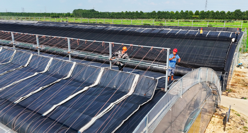 7月29日,連云港市海州區(qū)崗埠農(nóng)場,工作人員正在檢查、加固蔬菜大棚,防范臺(tái)風(fēng)“竹節(jié)草”。 耿玉和 徐衛(wèi) 攝(視覺江蘇網(wǎng)供圖)
