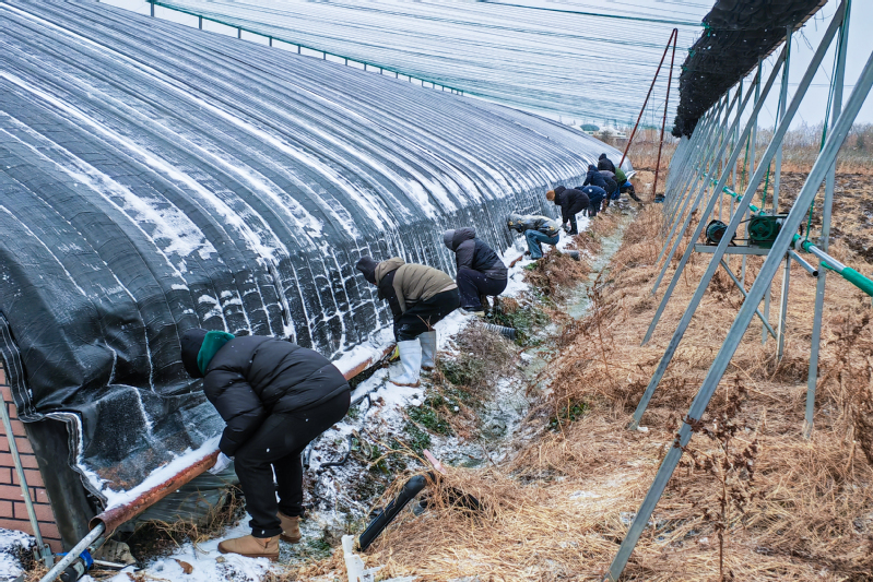 面對大風和積雪壓力,設施結構的穩(wěn)固是第一道關卡。“一、二、三!大家不要松手,再加把勁?!?月18日一大早,為應對寒潮,高效農業(yè)示范園第一時間組織人員對園區(qū)內所有大棚進行全面加固。同時,對保溫棉被進行檢修和更換,確保其保溫性能處于最佳狀態(tài)。同樣,在云臺農場云水灣景區(qū),技術團隊也提前完成了所有生產大棚的結構檢查與加固,重點提升設施的物理抗逆能力,云水灣景區(qū)負責人崔婷婷介紹道,“所有棚室的通風口均已提前密封,并儲備了充足的專用保溫被,用于夜間覆蓋以有效蓄熱。例如在藍莓種植區(qū),我們特別采取了‘雙層覆膜+加厚保溫被’的強化方案,全力鎖住溫度。工作人員也加強了監(jiān)控和維護,確保農作物的健康生長?!?/p>