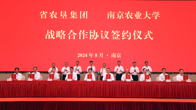8月9日下午,省農(nóng)墾集團(tuán)與南京農(nóng)業(yè)大學(xué)戰(zhàn)略合作協(xié)議簽約儀式在南京舉行。集團(tuán)公司黨委書記、董事長(zhǎng)吳本輝致辭,南京農(nóng)業(yè)大學(xué)黨委書記王春春出席并講話。集團(tuán)公司黨委副書記、總經(jīng)理姜建友、副書記朱浩出席簽約儀式,黨委委員、副總經(jīng)理王立新主持簽約儀式,南京農(nóng)業(yè)大學(xué)校長(zhǎng)陳發(fā)棣、黨委副書記吳榮順、黨委常委、副校長(zhǎng)單正豐出席簽約儀式。吳本輝對(duì)王春春一行的到來(lái)表示熱烈歡迎,他指出,南京農(nóng)業(yè)大學(xué)作為近現(xiàn)代中國(guó)高等農(nóng)業(yè)教育的拓荒者,以立德樹(shù)人為根本,以強(qiáng)農(nóng)興農(nóng)為己任,在江蘇現(xiàn)代農(nóng)業(yè)科技創(chuàng)新、科技服務(wù)、人才引培、對(duì)外合作等方面發(fā)揮重要作用,是支撐全國(guó)全省現(xiàn)代農(nóng)業(yè)學(xué)科的主力軍和先鋒隊(duì)。近年來(lái),雙方在綠色低碳、智慧農(nóng)業(yè)、生物育種等領(lǐng)域開(kāi)展合作研究,合作成果豐碩,互動(dòng)交流日益深入,充分彰顯了產(chǎn)學(xué)研合作的深厚根基和巨大潛力。他強(qiáng)調(diào),江蘇農(nóng)墾將以此次全面戰(zhàn)略合作為契機(jī),大力實(shí)施招才引智,設(shè)立南京農(nóng)業(yè)大學(xué)“江蘇農(nóng)墾獎(jiǎng)學(xué)金”用于獎(jiǎng)勵(lì)表現(xiàn)優(yōu)異的全日制在校生;靈活運(yùn)用“揭榜掛帥”等模式,在智慧農(nóng)場(chǎng)、生物育種、花卉園藝、肉制品加工、新型肥料、生物藥劑等方向開(kāi)展技術(shù)研發(fā)和創(chuàng)新工作。期待雙方進(jìn)一步鞏固和深化合作交流,緊密攜手,同向發(fā)力