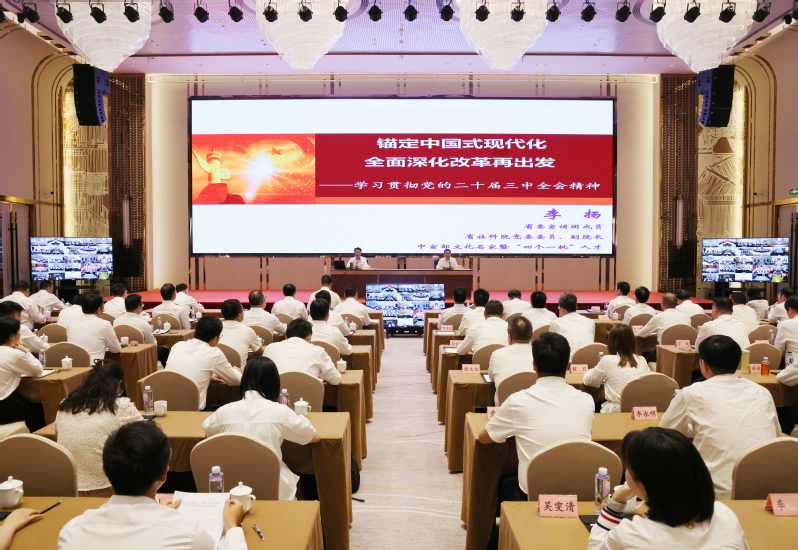 按照省委統(tǒng)一部署,8月6日,學(xué)習(xí)貫徹黨的二十屆三中全會(huì)精神省委宣講團(tuán)報(bào)告會(huì)在江蘇農(nóng)墾舉行。省委宣講團(tuán)成員、省社會(huì)科學(xué)院黨委委員、副院長(zhǎng)李揚(yáng)作宣講報(bào)告。集團(tuán)公司黨委書記、董事長(zhǎng)吳本輝主持報(bào)告會(huì)。集團(tuán)公司領(lǐng)導(dǎo)姜建友、朱浩、劉耀武、殷紅、劉衛(wèi)華、周倍佳、鄧國(guó)新出席報(bào)告會(huì)。報(bào)告會(huì)上,李揚(yáng)圍繞學(xué)習(xí)貫徹黨的二十屆三中全會(huì)精神,以“錨定中國(guó)式現(xiàn)代化、全面深化改革再出發(fā)”為題,從意義論,改革開(kāi)放史上劃時(shí)代的又一里程碑;認(rèn)識(shí)論,進(jìn)一步全面深化改革的重要性必要性;邏輯論,為中國(guó)式現(xiàn)代化提供有力制度保障;方法論,牢牢把握進(jìn)一步全面深化改革的重大原則;重點(diǎn)論,以經(jīng)濟(jì)體制改革為牽引推動(dòng)高質(zhì)量發(fā)展;實(shí)踐論,以釘釘子精神抓好改革落實(shí)等六個(gè)方面進(jìn)行了系統(tǒng)闡述了深入解讀。他指出,黨的二十屆三中全會(huì)把進(jìn)一步全面深化改革、推進(jìn)中國(guó)式現(xiàn)代化作為主題,是黨中央總結(jié)新時(shí)代以來(lái)全面深化改革重大成就作出的重要判斷,抓住了事業(yè)發(fā)展的核心和關(guān)鍵,意義十分重大。全會(huì)通過(guò)的《決定》既是黨的十八屆三中全會(huì)以來(lái)全面深化改革的實(shí)踐續(xù)篇,也是新征程推進(jìn)中國(guó)式現(xiàn)代化的時(shí)代新篇,是我們黨歷史上又一重要綱領(lǐng)性文獻(xiàn)。要堅(jiān)持以習(xí)近平新時(shí)代中國(guó)特色社會(huì)主義思想