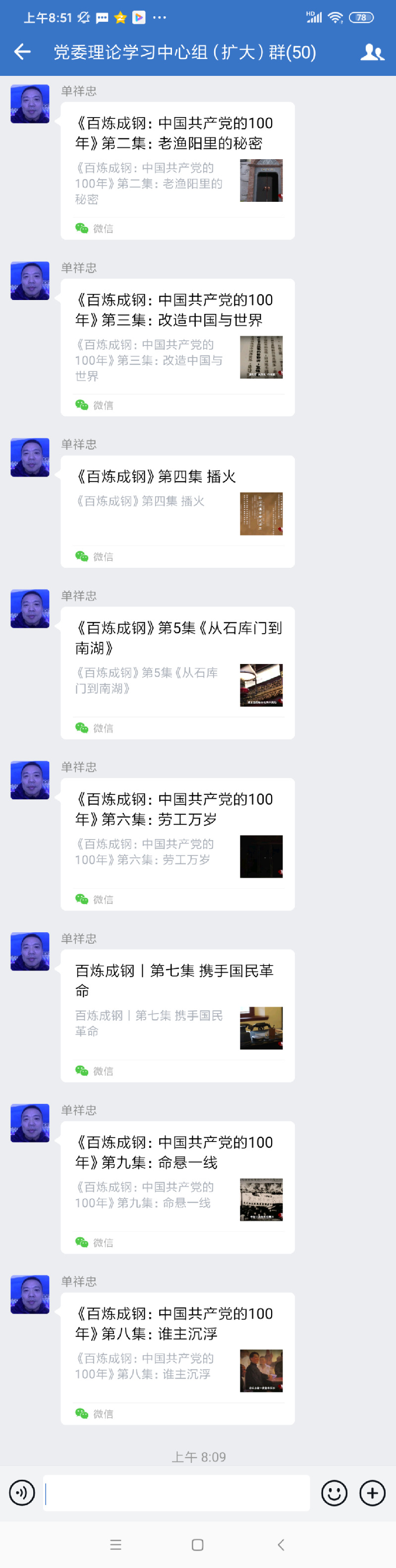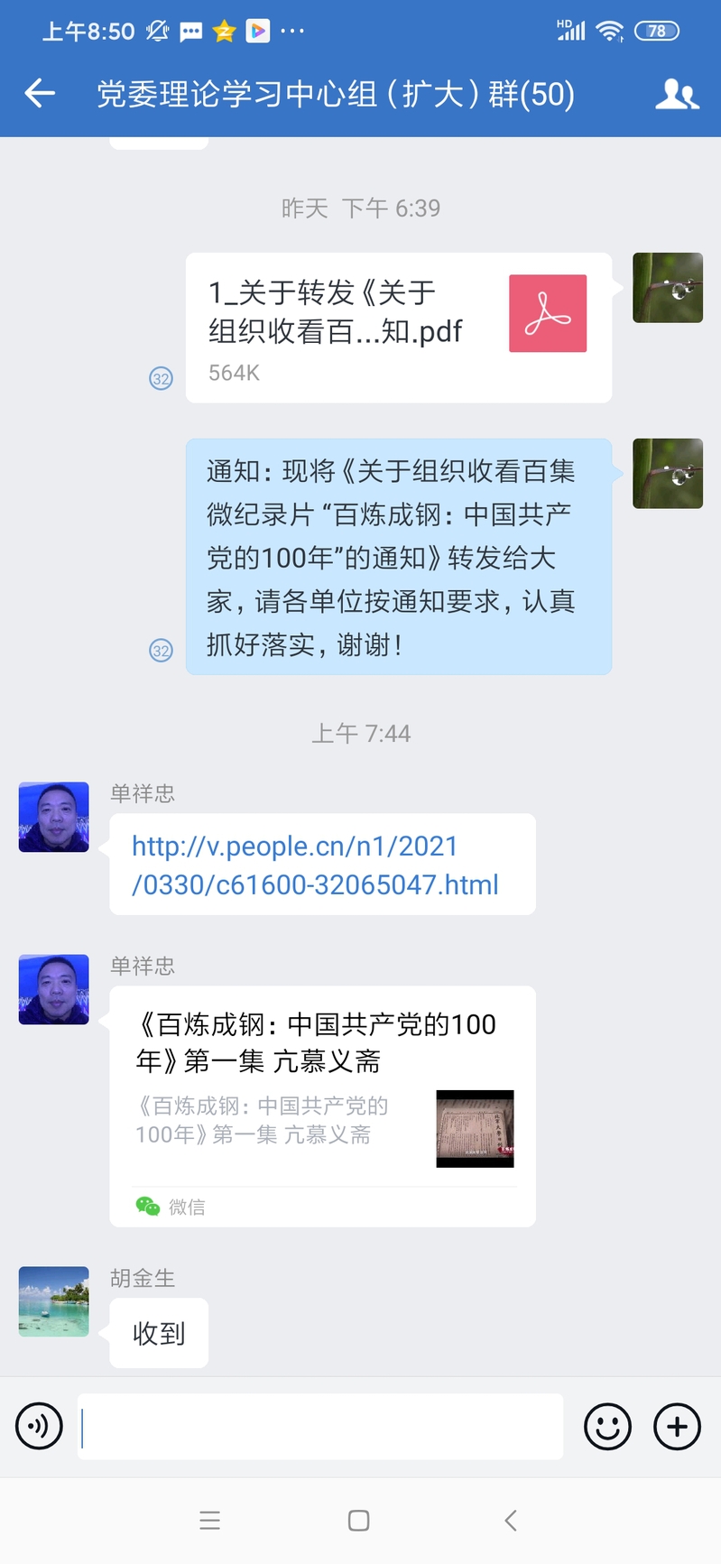 淮海農(nóng)場(chǎng)公司在昨天傍晚接到江蘇農(nóng)墾黨史學(xué)習(xí)教育第三組《關(guān)于組織收看百集微紀(jì)錄片百煉成鋼:中國(guó)共產(chǎn)黨的100的通知》后,立刻借助企業(yè)微信平臺(tái)黨委理論學(xué)習(xí)中心組(擴(kuò)大)群進(jìn)行轉(zhuǎn)發(fā)落實(shí),農(nóng)場(chǎng)黨委書記單祥忠在今天上午便將搜集來的《百煉成鋼:中國(guó)共產(chǎn)黨的100》的紀(jì)錄片第1至第9集的視頻發(fā)布的學(xué)習(xí)群中,并以此來進(jìn)一步激發(fā)起廣大黨員干部職工學(xué)習(xí)黨史的熱情,在方便大家觀看學(xué)習(xí)中,不斷提升黨史的學(xué)習(xí)教育成效。