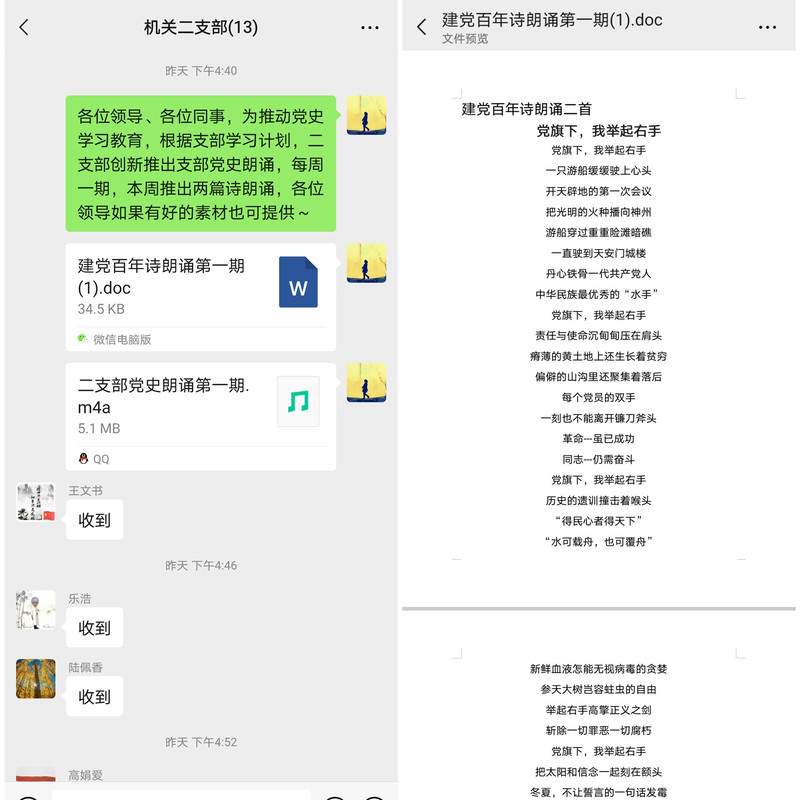 “黨旗下,我舉起右手,一只游船緩緩駛上心頭,開天辟地的第一次會(huì)議,把光明的火種播向神州……”4月21日,新洋農(nóng)場(chǎng)有限公司機(jī)關(guān)二支部微信群里,支部黨建助理員分享了建黨百年朗誦第一期音頻,這是該支部創(chuàng)新黨史學(xué)習(xí)教育形式的新內(nèi)容。自黨史學(xué)習(xí)教育開展以來(lái),機(jī)關(guān)二支部緊緊圍繞“學(xué)黨史、悟思想、辦實(shí)事、開新局”總要求,堅(jiān)持多措并舉,力求黨史學(xué)習(xí)教育走“新”更走“心”。