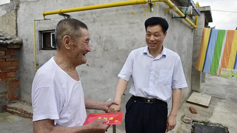 在健康居委會(huì)老黨員邵恒江家,姚春華與邵恒江親切握手,并代表農(nóng)場(chǎng)公司黨委向他表示崇高的敬意和誠摯的問候,還向他送上了省國(guó)資委黨委的節(jié)日慰問金。