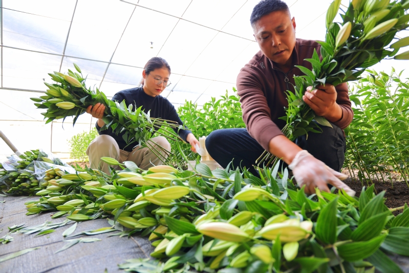 寒冬時(shí)節(jié),崗埠農(nóng)場(chǎng)高效農(nóng)業(yè)示范園11號(hào)大棚內(nèi)一片春意盎然。一株株百合花挺拔站立,不少花苞已露出粉色,在綠葉的襯托下格外嬌艷動(dòng)人。去年,崗埠農(nóng)場(chǎng)高效農(nóng)業(yè)示范園大力發(fā)展鮮切花產(chǎn)業(yè),引進(jìn)了“中國(guó)紅”“索蚌”等百合花品種,共種植14萬(wàn)株。通過(guò)為周邊種植戶提供技術(shù)指導(dǎo),農(nóng)場(chǎng)帶動(dòng)大家發(fā)展鮮切花產(chǎn)業(yè)。圖為工作人員正在整理百合鮮切花。