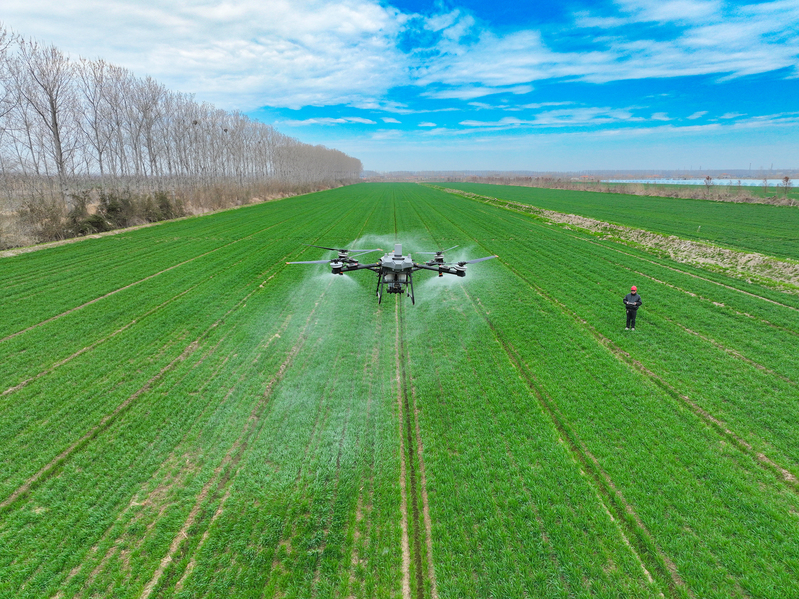3月13日,江蘇省鹽城市射陽縣,在江蘇農(nóng)墾新洋農(nóng)場的一處高標(biāo)準(zhǔn)農(nóng)田里,農(nóng)技人員正在操縱一臺新式植保無人機(jī),為小麥開展春季施肥作業(yè)。當(dāng)前,新洋農(nóng)場6萬畝高標(biāo)準(zhǔn)農(nóng)業(yè)生產(chǎn)基地進(jìn)入春管關(guān)鍵階段,該農(nóng)場搶抓農(nóng)時,積極開展春季田管作業(yè),助力夏糧穩(wěn)產(chǎn)增收。