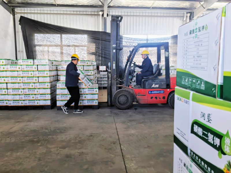 當(dāng)前是春耕的關(guān)鍵時(shí)期,蘇墾農(nóng)服統(tǒng)籌調(diào)配生產(chǎn)采購(gòu)、農(nóng)資銷(xiāo)售、物流運(yùn)輸、技術(shù)服務(wù)等各環(huán)節(jié),全力投入到春季農(nóng)業(yè)社會(huì)化服務(wù)工作中。圖為蘇墾農(nóng)服子公司大華生物的倉(cāng)儲(chǔ)庫(kù)房,工人在搬運(yùn)肥料。