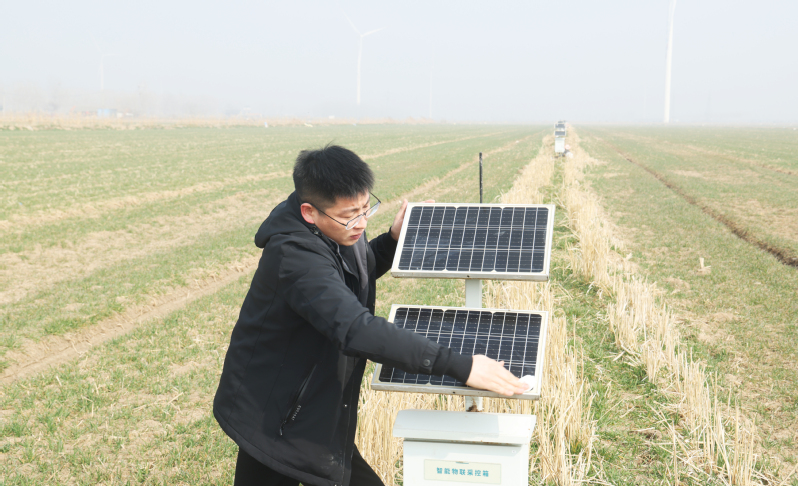 蘇墾農(nóng)發(fā)黃海分公司智慧灌溉試驗(yàn)區(qū)實(shí)施智慧灌溉系統(tǒng)按需供水和按需排水,實(shí)現(xiàn)田間灌溉精量化管理,水資源綜合利用率提高20%以上,田間灌溉農(nóng)業(yè)用電降低25%以上。圖為工作人員在維護(hù)光伏板。