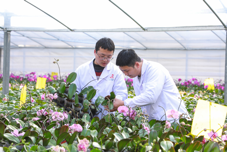 在云臺(tái)農(nóng)場(chǎng)興墾科技溫室蝴蝶蘭育苗基地,工作人員正在對(duì)區(qū)域內(nèi)蝴蝶蘭植株進(jìn)行管護(hù)。作為高端觀賞花卉,蝴蝶蘭觀賞性強(qiáng),市場(chǎng)價(jià)格較高,云臺(tái)農(nóng)場(chǎng)結(jié)合花卉培育,發(fā)展休閑觀光、研學(xué)體驗(yàn)等項(xiàng)目吸引游客,為農(nóng)場(chǎng)帶來(lái)顯著的經(jīng)濟(jì)收益。此外,蝴蝶蘭培育需要精準(zhǔn)的溫控、光照、組培技術(shù)等,云臺(tái)農(nóng)場(chǎng)興墾科技依托現(xiàn)代農(nóng)業(yè)科技,培育特色花卉,打造自有品牌,增強(qiáng)市場(chǎng)競(jìng)爭(zhēng)力。目前,該基地現(xiàn)有大小苗蝴蝶蘭18萬(wàn)株,品種包含紅蝴蝶、安娜、滿天紅等200多個(gè)品種。下一步,將把總株數(shù)擴(kuò)大至60萬(wàn)株,并于3月底完成蝴蝶蘭組培室搭建工作,為蝴蝶蘭組培苗技術(shù)研發(fā)和產(chǎn)業(yè)化生產(chǎn)銷(xiāo)售提供堅(jiān)實(shí)基礎(chǔ)。