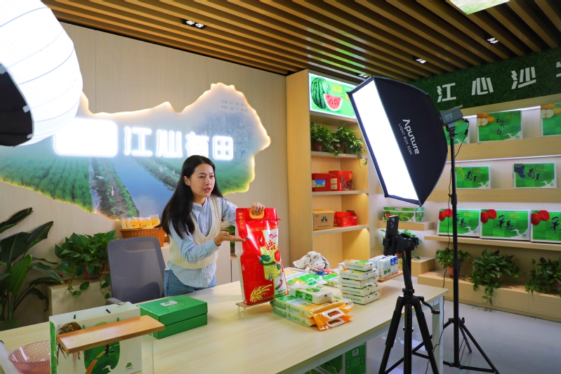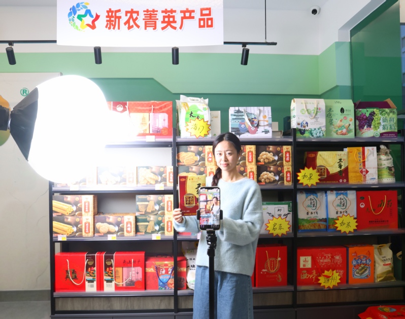 蘇墾南通公司積極與南通團市委合作,在銷售門店開辟“新農(nóng)菁英產(chǎn)品”專區(qū),匯聚南通各縣市區(qū)的地方特色優(yōu)質(zhì)農(nóng)產(chǎn)品,豐富周邊居民的購買選擇。圖為公司青年員工借助抖音直播推廣帶動產(chǎn)品銷售,拓寬增收渠道。
